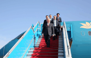 Phó Thủ tướng Thường trực Nguyễn Hòa Bình bước xuống sân bay Long Thành từ máy bay của hãng hàng không Việt Nam, sáng 19-12